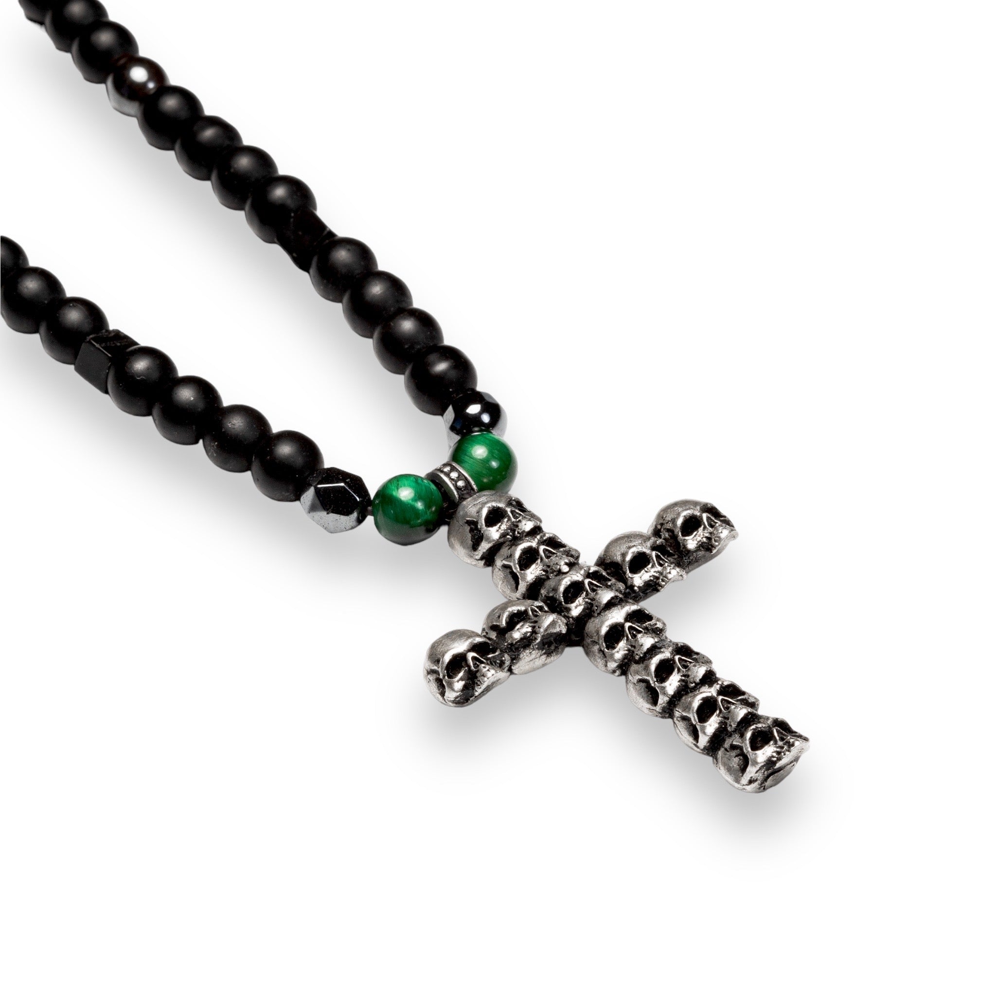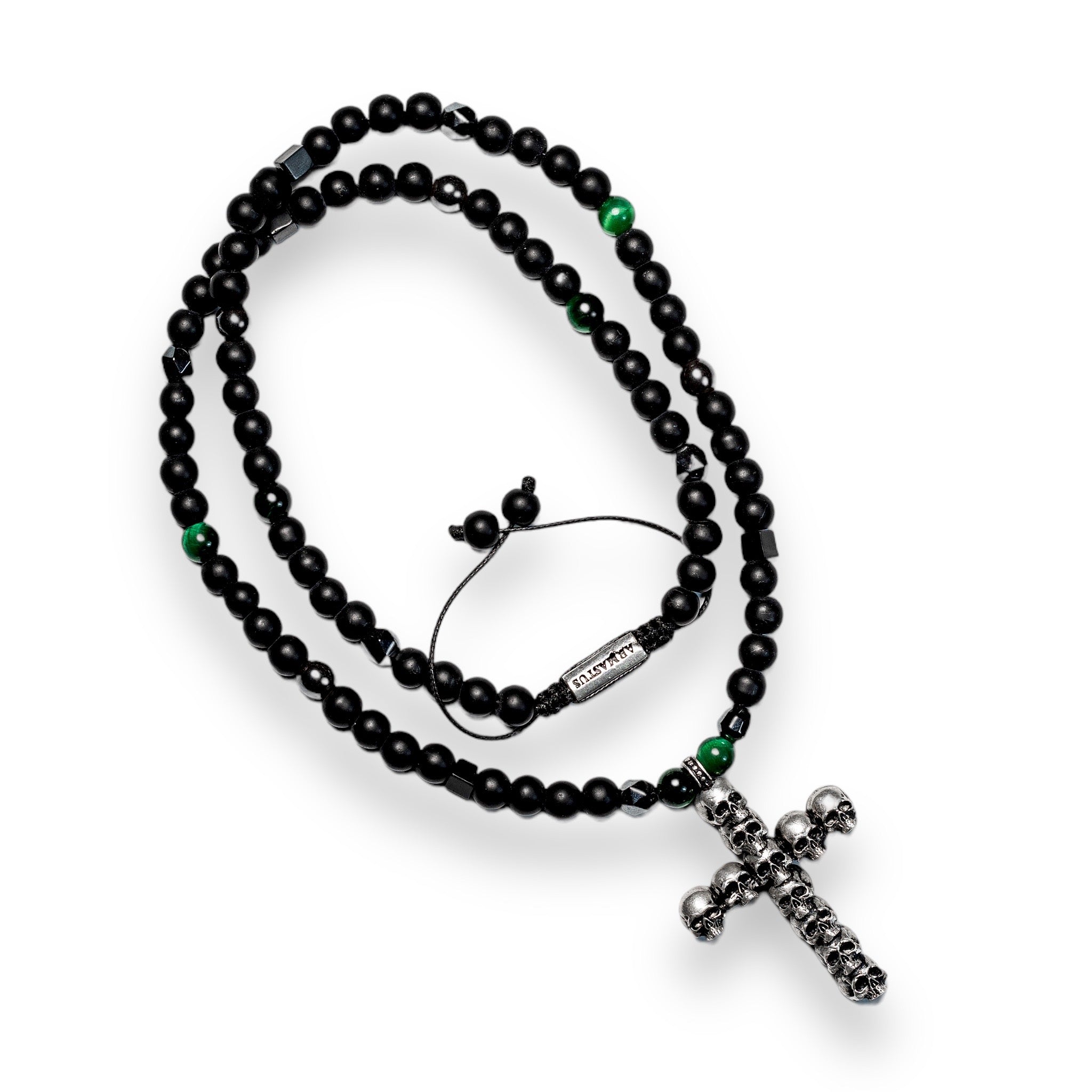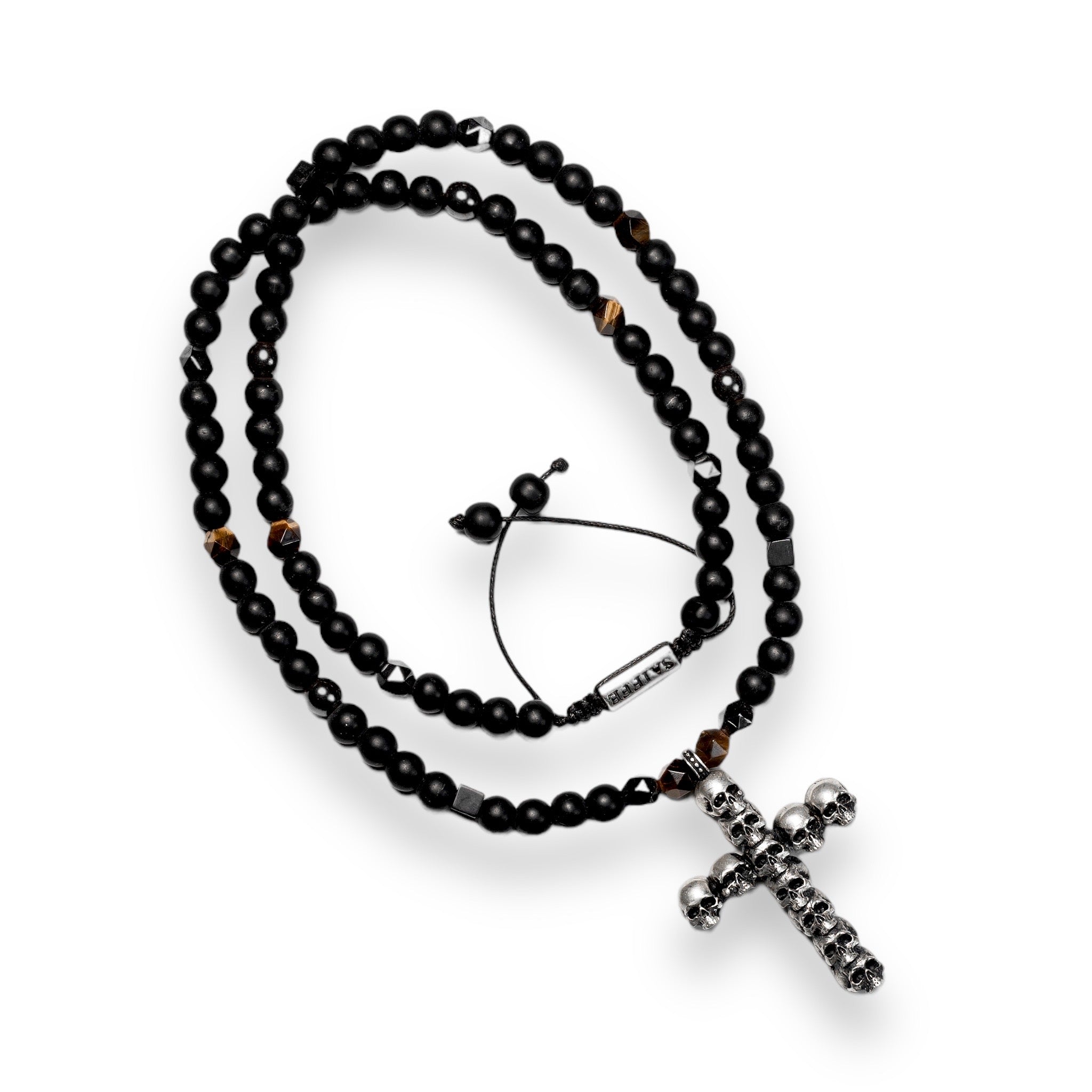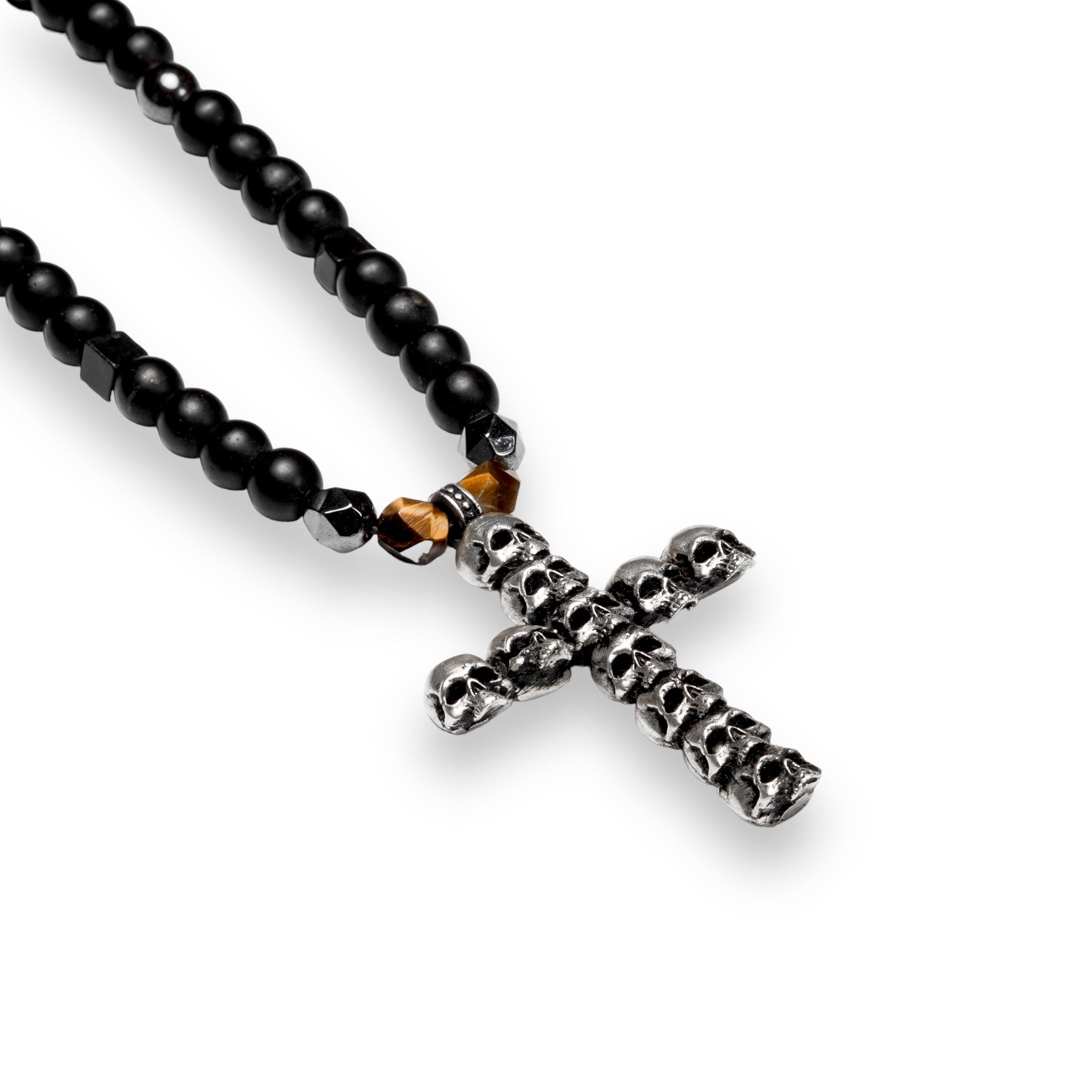 Nuestro Dije de cráneos hecho de plata es una representación de la igualdad, queriendo dar a entender que todos somos lo mismo y nuestro destino en esta vida es igual al de todos. El collar va acompañado de piedras semipreciosas como Onix y Ojo de tigre en diferentes colores Facetado.